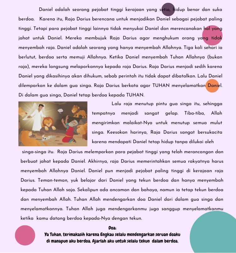 Daniel adalah seorang pejabat tinggi kerajaan yang setia, hidup benar dan suka berdoa. Karena itu, Raja Darius berencana untuk menjadikan Daniel sebagai pejabat paling tinggi. Tetapi para pejabat tinggi lainnya tidak menyukai Daniel dan merencanakan hal yang jahat untuk Daniel.