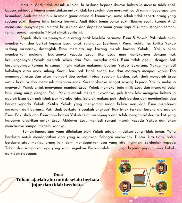 Bacaan: Kejadian 27:1-40 Ayat Hafalan: Kolose 3:9 “Jangan lagi kamu saling mendustai.”