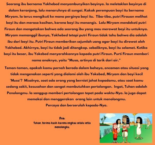 Ada seorang Raja Mesir bernama Firaun. Ia takut jika nanti orang Israel menguasai tanah Mesir. Itu sebabnya ia memerintahkan untuk menangkap semua bayi laki-laki orang Israel. Tentu semua ibu-ibu israel menjadi takut.